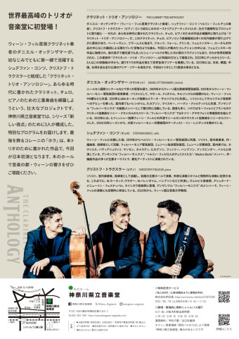 このクラリネット、チェロ、ピアノという楽器編成は多くの名作曲家が取り上げてきた歴史があり、ベートーヴェン、ブラームスに始まり、ブルッフ、フォーレ、グリンカ、ツェムリンスキー、ロータらの作品の中にはこの編成による隠れていた宝物のような曲も。今回3人が集めたコレクションの中には、ツェムリンスキーの作品に触発され、彼の弟子で義兄弟でもあったシェーンベルクが残した 16 小節のフラグメントもあり、それが世界初録音された。この意欲作「クラリネット・トリオ・アンソロジー」は7枚組の CD として録音され、2022 年にデッカからリリース。3人はこの収録曲の中から、選りすぐりの作品を携えて世界各地でツアーを展開している。