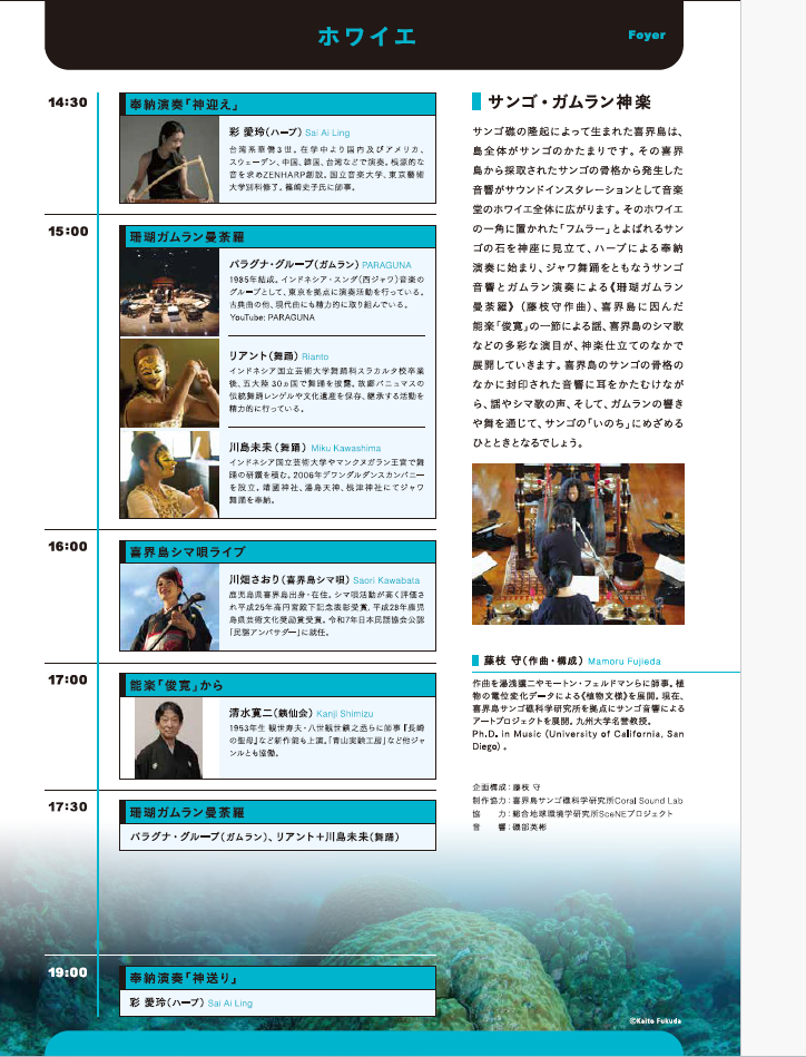 サンゴ礁の隆起によって生まれた喜界島は、島全体がサンゴのかたまりです。その喜界島から採取されたサンゴの骨格から発生した音響がサウンドインスタレーションとして音楽堂のホワイエ全体に広がります。そのホワイエの一角に置かれた「フムラー」とよばれるサンゴの石を神座に見立て、ハープによる奉納演奏に始まり、ジャワ舞踊をともなうサンゴ音響とガムラン演奏による《珊瑚ガムラン曼荼羅》(藤枝守作曲)、喜界島に因んだ能楽「俊寛」の一節による謡、喜界島のシマ歌などの多彩な演目が、神楽仕立てのなかで展開していきます。喜界島のサンゴの骨格のなかに封印された音響に耳をかたむけながら、謡やシマ歌の声、そして、ガムランの響きや舞を通じて、サンゴの「いのち」にめざめるひとときとなるでしょう。