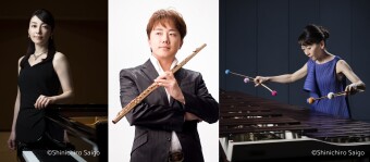 ※左から新居由佳梨(ピアノ)、荒川洋(フルート)、浜まゆみ(マリンバ)