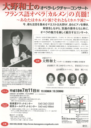 歌手:井上ゆかり(ソプラノ)、菅有実子(アルト)、志田雄啓(テノール)、黒田博(バス) お話とピアノ:大野和士 [ベルギー王立歌劇場(モネ劇場)音楽監督]