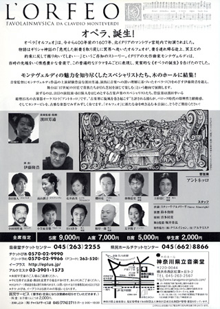 音楽監督・指揮:濱田芳通、演出:伊藤隆浩、出演:春日保人(オルフェオ)、高山潤子(エウリディーチェ)、花井尚美(ムジカ、プロセルピナ)、櫻田亮(アポロ、牧人、エコー)、彌勒忠史(使者、精霊)、上杉清仁(希望、牧人、精霊)、小田川哲也(カロンテ)、小笠原美敬(プルトーネ、牧人)、谷口洋介(牧人、精霊)、根岸一郎(牧人、精霊)、石井賢(牧人、精霊)、太宰陽子(ニンファ)、藤沢エリカ(ニンファ)、岡庭弥生(ニンファ)、伊藤英子(ニンファ)、高山由美(ニンファ)、千葉真智子(ニンファ)、今井典子(ニンファ)、堀万里絵(ニンファ)、下瀬太郎(マントヴァの領主)、谷明実(マントヴァの貴婦人) 管弦楽:アントネッロ