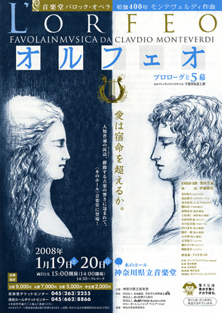 音楽監督・指揮:濱田芳通、演出:伊藤隆浩、出演:春日保人(オルフェオ)、高山潤子(エウリディーチェ)、花井尚美(ムジカ、プロセルピナ)、櫻田亮(アポロ、牧人、エコー)、彌勒忠史(使者、精霊)、上杉清仁(希望、牧人、精霊)、小田川哲也(カロンテ)、小笠原美敬(プルトーネ、牧人)、谷口洋介(牧人、精霊)、根岸一郎(牧人、精霊)、石井賢(牧人、精霊)、太宰陽子(ニンファ)、藤沢エリカ(ニンファ)、岡庭弥生(ニンファ)、伊藤英子(ニンファ)、高山由美(ニンファ)、千葉真智子(ニンファ)、今井典子(ニンファ)、堀万里絵(ニンファ)、下瀬太郎(マントヴァの領主)、谷明実(マントヴァの貴婦人) 管弦楽:アントネッロ
