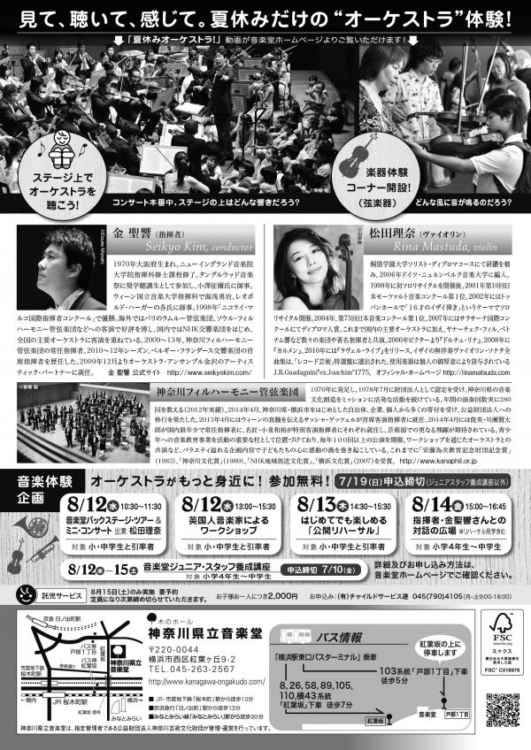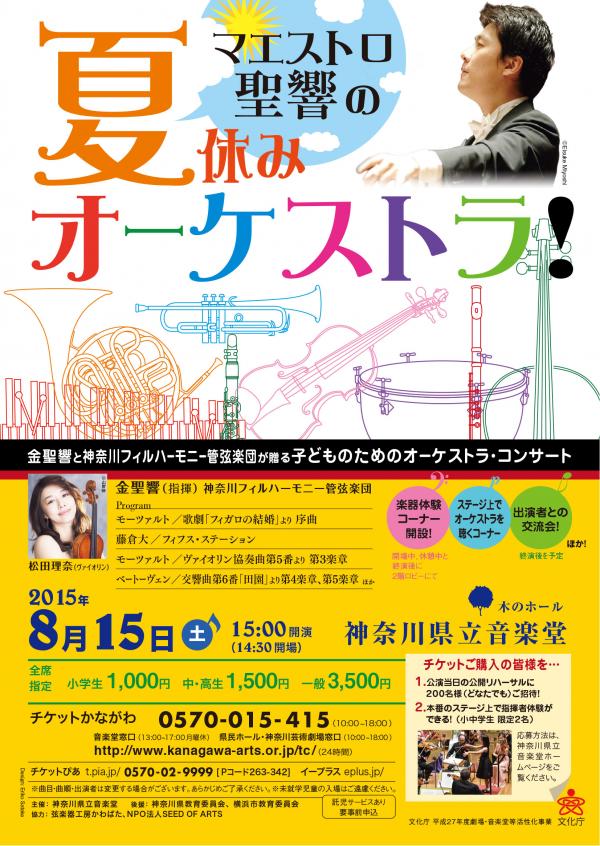 金聖響(指揮) 松田理奈(ヴァイオリン) 神奈川フィルハーモニー管弦楽団モーツァルト:歌劇「フィガロの結婚」より 序曲 ブラームス:交響曲第3番より第3楽章 藤倉大:フィフス・ステーション モーツァルト:ヴァイオリン協奏曲 第5番より 第3楽章 ホルスト:セント・ポール組曲より第4楽章 ベートーヴェン:交響曲第6番「田園」より第4楽章、第5楽章 ほか金聖響 (指揮者) 1970年大阪府生まれ。ニューイングランド音楽院大学院指揮科修士課程修了。タングルウッド音楽祭に奨学聴講生として参加し、小澤征爾氏に師事。ウィーン国立音楽大学指揮科で湯浅勇治、レオポルド・ハーガーの各氏に師事。1998年「ニコライ・マルコ国際指揮者コンクール」で優勝。海外ではパリのラムルー管弦楽団、ソウル・フィルハーモニー管弦楽団などへの客演で好評を博し、国内ではNHK交響楽団をはじめ、全国の主要オーケストラに客演を重ねている。2009年4月から神奈川フィルハーモニー管弦楽団の常任指揮者、2010~12年シーズン、ベルギー・フランダース交響楽団の首席指揮者を歴任した。2009年12月よりオーケストラ・アンサンブル金沢のアーティスティック・パートナーに就任。金 聖響 公式サイト http://www.seikyokim.com/ 松田理奈(ヴァイオリン) 桐朋学園大学ソリスト・ディプロマコースにて研鑽を積み、2006年ドイツ・ニュルンベルク音楽大学に編入。1999年に初ソロリサイタルを開催後、2001年第10回日本モーツァルト音楽コンクール第1位。2002年にはトッパンホールで「16才のイザイ弾き」というテーマでソロリサイタル開催。2004年、第73回日本音楽コンクール第1位、2007年にはサラサーテ国際コンクールにてディプロマ入賞。これまで国内の主要オーケストラに加え、ヤナーチェク・フィル、ベトナム響など数々の楽団や著名指揮者と共演。2006年ビクターより『ドルチェ・リナ』、2008年に『カルメン』、2010年には『ラヴェル・ライブ』をリリース。イザイの無伴奏ヴァイオリン・ソナタ全曲集は、「レコード芸術」特選盤に選出された。使用楽器は個人の御厚意により貸与されているJ.B.Guadagnini "ex.Joachim"1775.オフィシャル・ホームページhttp://linamatsuda.com 神奈川フィルハーモニー管弦楽団 1970年に発足し、1978年7月に財団法人として認定を受け、神奈川県の音楽文化創造をミッションに活発な活動を続けている。年間の演奏回数実に280回を数える(2012年実績)。2014年4月、神奈川県・横浜市をはじめとした自治体、企業、個人から多くの寄付を受け、公益財団法人への移行を果たした。2013年4月にはウィーンの真髄を伝えるサッシャ・ゲッツェルが首席客演指揮者に就任、2014年4月には俊英・川瀬賢太郎が国内最年少で常任指揮者に、名匠・小泉和裕が特別客演指揮者にそれぞれ就任し、芸術面での更なる飛躍が期待されている。青少年への音楽教育事業を活動の重要な柱として位置づけており、毎年100回以上の公演を開催。ワークショップを通じたオーケストラとの共演など、バラエティ溢れる企画内容で子どもたちの心に感動の渦を巻き起こしている。これまでに「安藤為次教育記念財団記念賞」(1983)、「神奈川文化賞」(1989)、「NHK地域放送文化賞」、「横浜文化賞」(2007)を受賞。http://www.kanaphil.or.jp