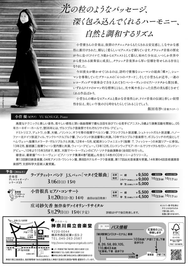シューマン:蝶々 Op.2 ブラームス:バラード集 Op.10 1.ニ短調「エドワード」 2.ニ長調 3.ロ短調 4.ロ長調 ベートーヴェン:ピアノ・ソナタ 第31番 変イ長調 Op.110 *曲目・曲順は変更になる場合があります。小菅 優 (ピアノ) 高度なテクニックと美しい音色、若々しい感性と深い楽曲理解で最も注目を浴びている若手ピアニスト。9歳より演奏活動を開始し、05年カーネギー・ホールで、翌06年には、ザルツブルク音楽祭でそれぞれリサイタル・デビュー。 ドミトリエフ、デュトワ、小澤、大植、ノリントン、オラモ等の指揮でベルリン響、フランクフルト放送響、シュトゥットガルト放送響、ハノーファー北ドイツ放送フィル、サンクトペテルブルク響、フィンランド放送響等と共演。10年ザルツブルク音楽祭で、ポゴレリッチの代役としてヘレヴェッヘ指揮カメラータ・ザルツブルクと共演。12年4~5月、紀尾井シンフォニエッタ(指揮:T.フィッシャー)の米国ツアーに参加。13年2月、服部譲二指揮ウィーン室内管と共演、ウィーン・デビュー。13年12月、ロンドン ウィグモア・ホールでリサイタルを行い、ロンドン・デビュー。10年より15年3月まで、東京、大阪でベートーヴェンのピアノ・ソナタ全曲演奏会(全8回)を行った。 録音は、最新盤「ベートーヴェン:ピアノ・ソナタ集第4巻『超越』」を含む14枚のCDをソニーよりリリース。 第13回新日鉄音楽賞、04年アメリカ・ワシントン賞、第8回ホテルオークラ音楽賞、第17回出光音楽賞を受賞。14年 第64回芸術選奨音楽部門 文部科学大臣新人賞受賞。チケット