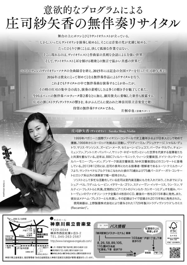 ベートーヴェンのヴァイオリン・ソナタの全曲録音を終え、2015年には記念の全国ツアーを行った庄司紗矢香が、2016年は彼女にとって初めてとなる無伴奏作品によるリサイタルを行う。これまでもリサイタルの中で無伴奏曲を演奏することがあったが、その時の庄司の集中力の高さ、演奏の素晴らしさは多くの聴き手を魅了して来た。今回はバッハの無伴奏パルティータ第2番などに加え、細川俊夫に委嘱した新作も披露する。庄司の弾くストラディヴァリウスの響きを、木がふんだんに使われた神奈川県立音楽堂で聴く。待望の無伴奏リサイタルである。