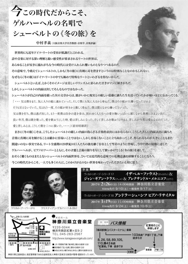 クリスティアン・ゲルハーヘル(バリトン) ゲロルト・フーバー(ピアノ)シューベルト:歌曲集「冬の旅」クリスティアン・ゲルハーヘル〔バリトン〕 Christian Gerhaher (Baritone) 現代屈指のバリトンとして、オペラ公演、オーケストラ・コンサート、そしてリート・リサイタルと世界中で活躍しているドイツを代表する歌手。 ミュンヘン国立音楽大学オペラ・スクールにおいて、パウル・クーエンとライムンド・グリュンバッハに師事。ピアノのゲロルト・フーバーと共に、ヘルムート・ドイチュのリート・クラスおよびディートリヒ・フィッシャー=ディースカウ、エリザベート・シュワルツコップ、インゲ・ボルグのマスタークラスを受講した。その間、自身もミュンヘン音楽大学で教鞭をとる。現在は同大学の名誉教授。バイエルン・マキシミリアン勲位を得ている。 1998年、パリ・ニューヨークのインターナショナル・プロ・ムジチスで第1位に選ばれ、ニューヨークのカーネギー・ホールでデビューを飾る。 以降、欧米の各都市の主要なコンサートホールに数多く出演し、ラトル、アーノンクール、ハイティンク、ブーレーズ、ティーレマン、ブロムシュテット、シャイー、ヤンソンス、ハーディング、ナガノなどの指揮者とともに世界の主要オーケストラと共演。オペラでは2006年ザルツブルク音楽祭で、リッカルド・ムーティ指揮の下パパゲーノを歌い、これはデッカよりDVDがリリースされた。ヘンツェの「ホンブルクの王子」をアン・デア・ウィーン劇場で、「タンホイザー」のヴォルフラムをマドリッド歌劇場、ウィーン国立歌劇場、バイエルン国立歌劇場、ロンドンのコヴェントガーデン王立歌劇場で歌った。 10年には、ウィーンとミュンヘンにおける「ホンブルクの王子」そしてヴォルフラムの公演で、ジャーナル・オペルンヴェルト誌のシンガー・オブ・ザ・イヤーに選出される。11年には、名誉あるローレンス・オリヴィエ賞を、13年ドイツの劇場における有名な「ファウスト」賞を受賞。 CDのリリースも数多く、いずれも高い評価を獲得、グラモフォン賞をはじめ、エコー・クラシック賞年間最優秀歌手、BBC音楽賞などを受賞。10年には、マーラーのアルバムがMIDEMクラシック賞年間最優秀歌手、オランダのエディソン・クラシック賞、ドイツ・レコード批評家賞年間最優秀賞を受賞。最近では管弦楽版「マーラー歌曲集」(ケント・ナガノ指揮モントリオール響)、J.S.バッハのマタイ受難曲、ヨハネ受難曲(共にラトル指揮ベルリン・フィル)、シューベルト歌曲集(Nachtviolen)(グラモフォン賞受賞)、モーツァルト:アリア集(ゴットフリート・フォン・ゴルツ指揮フライブルク・バロックオーケストラ)をリリースしている。 14/15シーズンのベルリン・フィルハーモニーのアーティスト・イン・レジデンスを務める。 ウィーンのムジークフェライン、ロンドンのウィグモアホールのアーティスト・イン・レジデンスに選ばれている。 ゲロルト・フーバー(ピアノ) Gerold Huber piano ドイツ、ミュンヘンに生まれる。ミュンヘン国立音楽大学にて、ピアノをフリーデマン・ベルガー、リート伴奏法をヘルムート・ドイチュに師事、その後ベルリンのディートリヒ・フィッシャー=ディースカウのリート・クラスで学ぶ。1998年にクリスティアン・ゲルハーヘルと共にパリ・ニューヨーク・インターナショナル・プロ・ムジチス賞を受賞し、パリとニューヨークのカーネギーホールでコンサートを行う。以後、世界の主要都市にて数多く演奏している。 リート伴奏者として高い評価を得ており、シュヴェツィンゲン音楽祭、ラインガウ音楽祭をはじめ名のある音楽祭に参加している。ゲルハーヘルの他にも、クリスティアン・カーグ、モイツァ・エルトマン、マキシミリアン・シュミットなど多くの歌手の伴奏を務め、またアルテミス・クァルテット、ヘンシェル・クァルテットやラインホルト・フリードリッヒの室内楽のパートナーとしても演奏会を行っている。 各地でのマスタークラス等で後進の指導にもあたっており、13年以降ヴュルツブルク音楽大学にて歌曲伴奏の教授を務めている。 ベートーヴェンの作品を収録したソロCDの他に、クリスティアン・ゲルハーヘルと共に録音した数々の素晴らしいCDがある。彼らのCD「冬の旅」と「美しき水車屋の娘」はそれぞれエコー・クラシック賞をリート部門で受賞し、シューマンの作品を収めたCD「夕べの情景」は06年にグラモフォン賞を受賞した。翌年からも次々と歌曲集のCDをリリース。ゲルハーヘルとのシューマン「メランコリー」はBBC音楽賞を、09年にリリースしたマーラーの歌曲集はドイツ・レコード批評家賞をはじめ複数の賞を受賞。最近のCDではゲルハーヘルとの共演で、ハイドン、ベートーヴェンにウィーン学派をあしらった「遥かな恋人」、さらに15年のグラモフォン賞を受賞したシューベルト歌曲集(Nachtviolen)があげられる。チケット