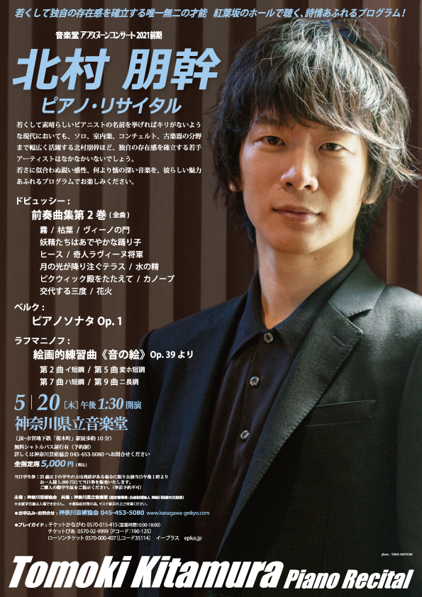 若くして素晴しいピアニストの名前を挙げればキリがないような現代においても、ソロ、室内楽、コンチェルト、古楽器の分野まで幅広く活躍する北村朋幹ほど、独自の存在感を確立する若手アーティストはなかなかないでしょう。若さに似合わぬ鋭い感性、何より懐の深い音楽を、ドビュッシーを中心とした幻想的世界へと誘うプログラムでお楽しみ下さい。
