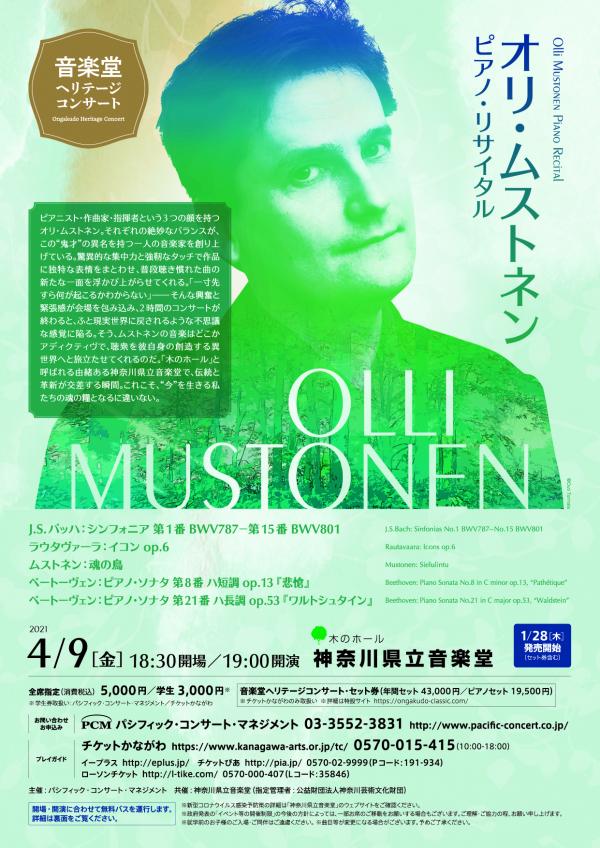 このたび、4月9日(金)に予定しておりました「音楽堂ヘリテージ・コンサート オリ・ムストネン ピアノ・リサイタル」については、新型コロナウイルス感染症の影響による入国規制の緩和の見通しが立たないため、やむを得ず公演の中止が決定しました。