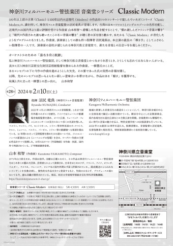 100年以上前の古典(Classic)と100年以内の近現代(Modern)の作品を1つのコンサートで楽しんでいただくシリーズ「Classic Modern」に、満を持して、神奈川フィル音楽監督の沼尻竜典が登場します。古典にはモーツァルトとメンデルスゾーンの名作を配し、近現代には国内外より高い評価を受ける作曲家 山本和智へ委嘱した作品を配することで、“慣れ親しんだクラシック音楽の響き”と“現代に作曲された誰も聴いたことのない音楽の響き”が聴く者の耳を揺り動かす、あたかも「Classic Modern」が音化したようなプログラムになりました。作曲家、演奏家としての顔も持つ指揮者 沼尻竜典は、本公演の最良の「導き手」としてふさわしい指揮者の一人です。演奏家の息吹が感じられる神奈川県立音楽堂で、新たな音楽との出会いをお楽しみください。