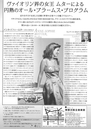 〈ピアノ〉ランバート・オルキス<出演者>アンネ=ゾフィー・ムター<演目><オール・ブラームス・プログラム> ヴァイオリン・ソナタ 第2番 イ長調 ヴァイオリン・ソナタ 第1番 ト長調「雨の歌」 ヴァイオリン・ソナタ 第3番 ニ短調 〈ピアノ〉ランバート・オルキス