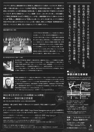 『長慶子(ちょうげいし)』【出演】東京楽所(管絃・舞楽)、佐々木冬彦(新作作曲・箜篌演奏)、假屋崎省吾(花)【演目】 第1部 管絃 『壱越調音取(いちこつちょうねとり)』 『胡飲酒(こんじゅ)』序・破 佐々木冬彦作曲 箜篌と雅楽のための『華の宴』(委嘱初演) 第2部 舞楽 『賀殿(かてん)』 『抜頭(ばとう)』 『長慶子(ちょうげいし)』