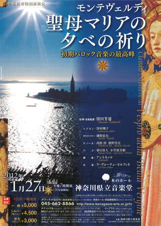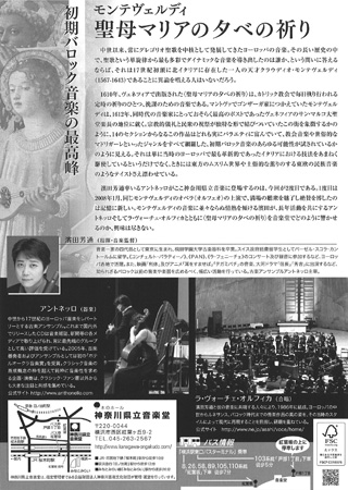 出演:濱田芳通(指揮・音楽監督)、澤村翔子(ソプラノ)、弥勒忠史(カウンターテノール)、高橋淳(テノール)、 鹿野浩史(テノール)、春日保人(バス)、小笠原美敬(バス)、アントネッロ(器楽)、ラ・ヴォーチェ・オルフィカ(合唱) 曲目:モンテヴェルディ作曲「聖母マリアの夕べの祈り」