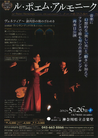 出演:ヴァンサン・デュメストル(音楽監督/バロック・ギター、テオルボ)クレール・ルフィリアートル(ソプラノ)セルジュ・グビウ(テノール)ヤン・ファン・エルザッカー(テノール)ジェフロイ・ビュフィエール(バス)ステファニー・フィステル(ヴァイオリン)ルカ・ペール(リローネ)フランソワーズ・エノック(ヴィオローネ)ジャン・リュク・タムビー(コラシオーネ、ギター)サミュエル・ドメルグ(パーカッション)バンジャマン・ラザール(ジェスチャー振り付け/演出) ※当初予定しておりましたアルノ・マルゾラーティ(バス)、ミラ・グロデアヌ(ヴァイオリン)、ジョエル・グラール(パーカッション)は、やむを得ぬ事情により、ジェフロイ・ビュフィエール(バス)、ステファニー・フィスター(ヴァイオリン)、サミュエル・ドマーグ(パーカッション)に変更になりました。ご了承ください。 曲目:クラウディオ・モンテヴェルディ:眠っていてもビアッジョ・マリーニ:ソナタ第3番クラウディオ・モンテヴェルディ:ニンフの哀歌フランチェスコ・マネッリ:ベルガマスカ:舟の客人たちベネデット・フェラーリ:愛を知らぬ者は 情熱に焦がされて作者不詳:井戸で会った娘たちフランチェスコ・マネッリ:カンツォネッタ:心くすぐる眼差し ハカラ(ナポリ風アリア) チャコーナ:わが心は燃え *当初の予定から曲目が一部変更となりました。ご了承ください。*字幕(歌詞)を投影します。途中休憩はございません。