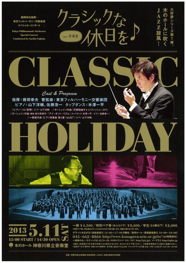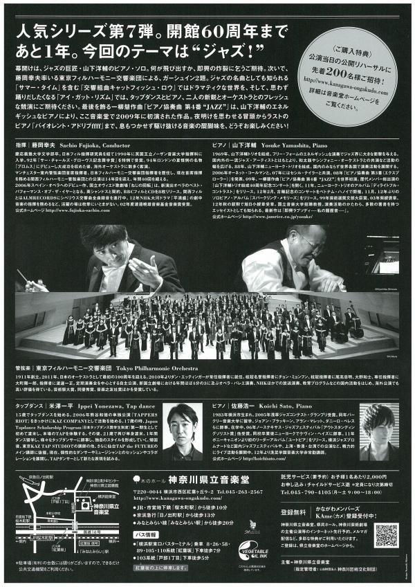 藤岡幸夫指揮 東京フィルハーモニー交響楽団 ピアノ 山下洋輔・佐藤浩一 タップダンス 米澤一平 1、ピアノ・ソロ《即興》/ピアノ 山下洋輔 2、ガーシュイン作曲『交響組曲キャットフィッシュ・ロウ』 3、ガーシュイン作曲『アイ・ガット・リズム』(編曲:新川奈津子) タップダンス 米澤一平 ピアノ 佐藤浩一 4、一柳慧作曲『ピアノ協奏曲第4番“JAZZ”』 ピアノ 山下洋輔
