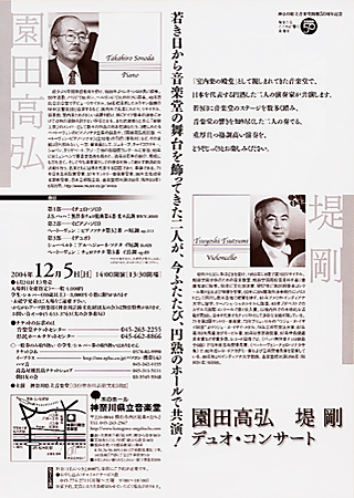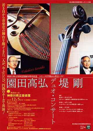 「園田高弘 堤剛 デュオ・コンサート」(12月5日(日)於:神奈川県立音楽堂)は、出演を予定しておりました園田高弘氏が10月7日に急逝されたため、内容を以下のように変更して開催いたします。