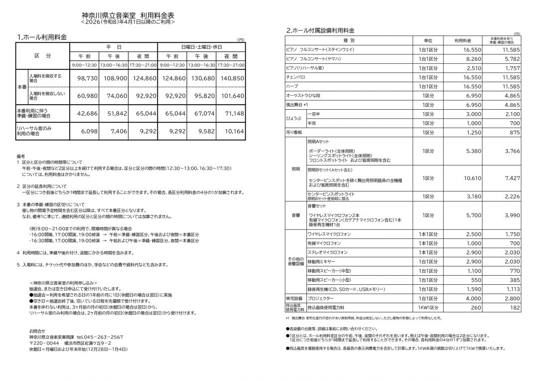 お知らせ 2025/3/26 【重要】神奈川県立音楽堂ご利用料金改正のお知らせ